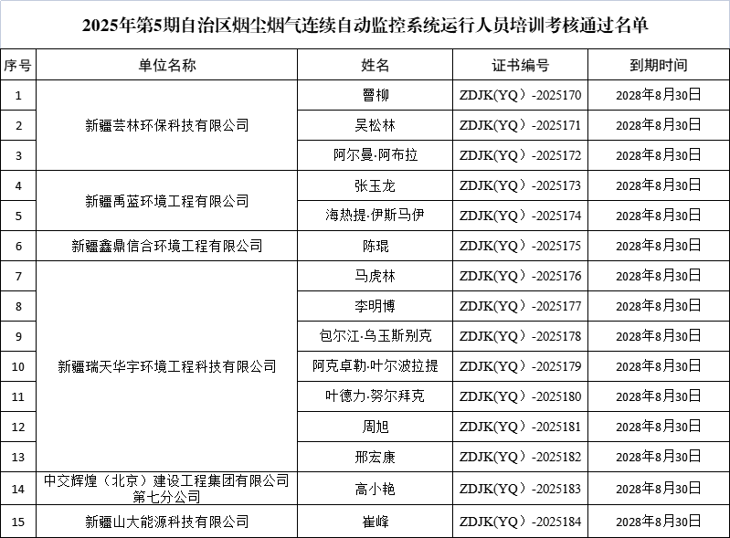 名单公布 | 2025年第5期自治区烟尘烟气连续自动监控系统运行人员培训班考核通过名单公布