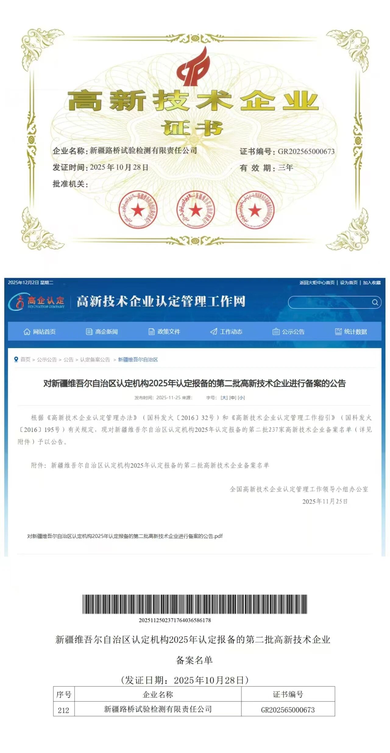 国家高新技术企业资质作为我国科技创新领域的权威认证,是对企业研发投入、成果转化、人才储备及管理水平的综合考量。此次成功获评,不仅是对新疆路桥试验检测公司核心竞争力的高度肯定,更是对公司多年来在技术创新道路上执着探索的最佳褒奖。