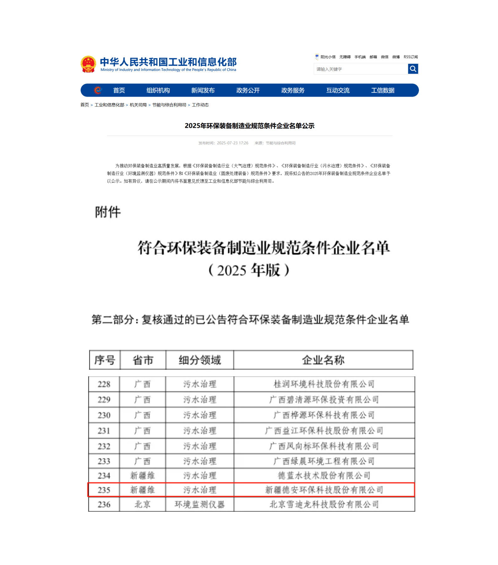 2025年7月23日,工业和信息化部正式公示《2025年环保装备制造业规范条件企业名单》。新疆德安环保凭借在污水治理领域的技术创新、规范生产与卓越实践,成功通过复审。
