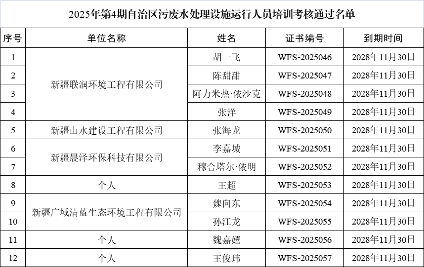 名单公布 | 2025年第4期自治区污废水处理工培训班考核通过名单公布
