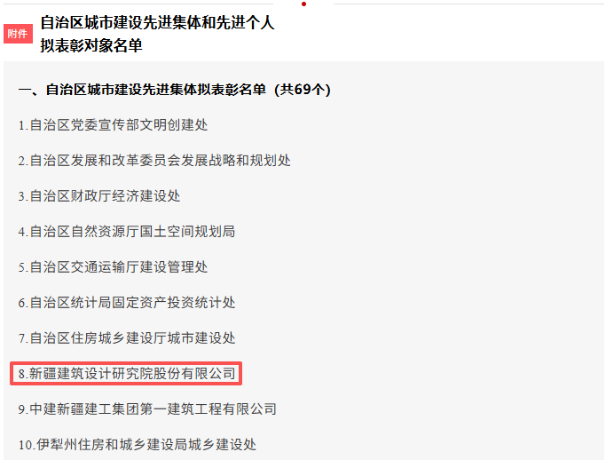 近日,自治区城市建设先进集体表彰名单正式揭晓,新疆建筑设计研究院股份有限公司凭借在城乡建设领域的卓越业绩、责任担当与创新实践,光荣获评 “自治区城市建设先进集体” 荣誉称号!这一殊荣是对公司70年深耕新疆、服务城市高质量发展的高度认可,更是对全体干部职工凝心聚力、砥砺奋进的莫大鞭策。