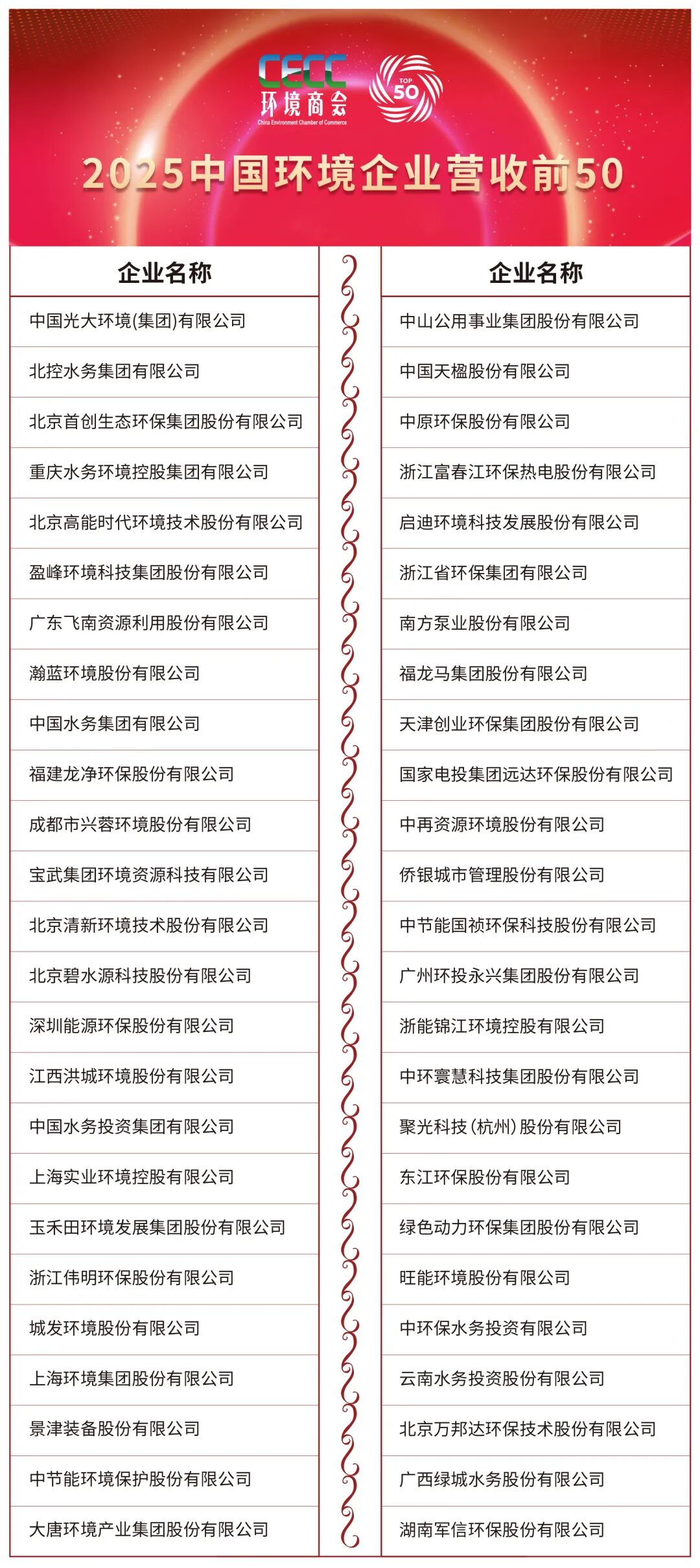 “2025中国环境企业营收前50”延续“50强”品牌,按照往届评选标准,以企业申报为基础,以公正公开为原则,以真实数据为依据,结合上规模环境企业调研,按照2024年度营业收入总额降序排列产生。其中,以环境为主营业务的上市公司按已公布的2024年报营收数据为准;环境类非上市公司以专业第三方机构提供的环境业务营收数据证明为准。同时,如某公司营收数据已计入母公司参评的,则此公司不再参评,以避免出现重复计数的情况。
