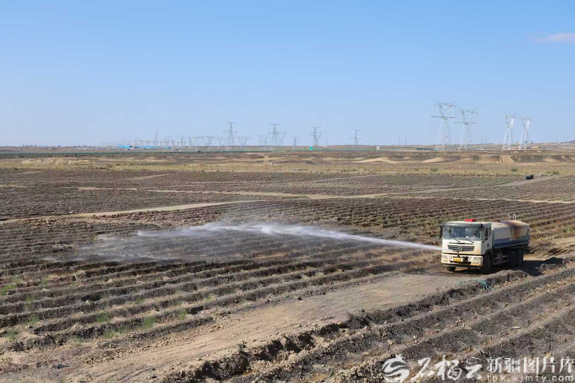 2025年4月,准噶尔盆地西缘(克拉玛依市)历史遗留废弃矿山生态修复示范工程1—4号子项目现场,工作人员在养护浇水。